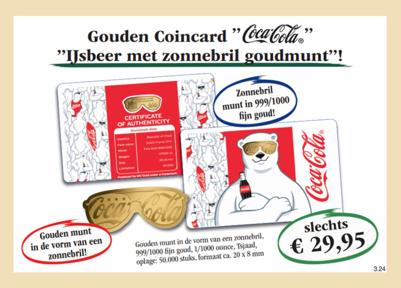 De gouden coincard „CocaCola® – ijsbeer met zonnebril goudmunt“!