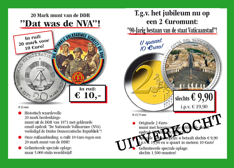 Winkelwagen U heeft nog geen artikelen in uw winkelwagen. De speciale 20 mark munt van de DDR met gekleurde email opdruk „Smalspoorbaan – Radebeul-Ost-Radeburg“! Verzekert u zich vandaag nog van de speciale 20 mark munt van de DDR met gekleurde email opdruk „Smalspoorbaan – Radebeul-Ost-Radeburg“ voor de „ruilprijs“ van slechts € 10,- en maandelijks een verdere uitgave uit deze collectie vrijblijvend en zonder koopverplicht ter inzage. U heeft bij iedere levering een 14 dagen teruggaverecht! 10,00 € incl. wettelijke BTW Aantal: Excl. aandelige verzendkosten Dit artikel kan slechts 5 keer per klant besteld worden. Bij vragen graag contact opnemen met onze klantenservice. Misschien is het volgende ook interessant voor u!