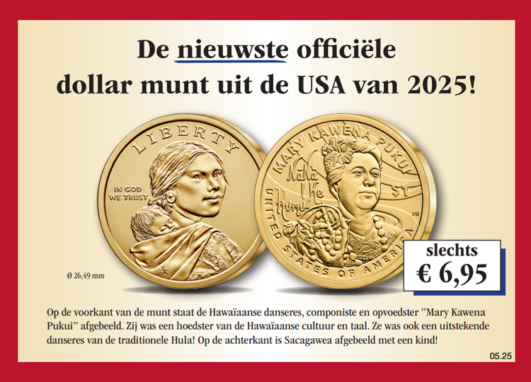 Winkelwagen U heeft nog geen artikelen in uw winkelwagen. De officiële dollar munt uit de USA „Mary Kawena Pukui“ van 2025! Verzekert u zich vandaag nog van de officiële dollar munt uit de USA „Mary Kawena Pukui“ van 2025 voor de speciale prijs van slechts € 6,95 en maandeljjks een verdere uitgave uit deze verzameling vrijblijvend en zonder koopverplichting ter inzage. U heeft bij iedere levering een 14 dagen teruggaverecht! 6,95 € incl. wettelijke BTW Aantal: Excl. aandelige verzendkosten Dit artikel kan slechts 5 keer per klant besteld worden. Bij vragen graag contact opnemen met onze klantenservice. Misschien is het volgende ook interessant voor u!