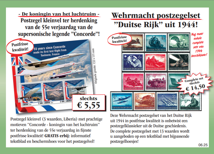 Winkelwagen U heeft nog geen artikelen in uw winkelwagen. Het postfris postzegel kleinvel ter herdenking van de 55e verjaardag van de supersonische legende „Concorde“! Verzekert u zich vandaag nog van het postfris postzegel kleinvel uit Liberia ter herdenking aan de 55e verjaardag van de supersonische legende „Concorde“ incl. informatief tekstblad en beschermhoes voor het postzegelvel voor de speciale prijs van slechts € 5,55 en maandelijks verdere uitgaven uit deze verzameling vrijblijvend en zonder koopverplichting ter inzage. U heeft bij iedere levering een 14 dagen teruggaverecht! 5,55 € incl. wettelijke BTW Aantal: Excl. aandelige verzendkosten Dit artikel kan slechts 5 keer per klant besteld worden. Bij vragen graag contact opnemen met onze klantenservice. De zeldzame Wehrmacht postzegelset „Duitse Rijk“ van 1944! Verzekert u zich vandaag nog van de zeldzame Wehrmacht postzegelset „Duitse Rijk“ van 1944 in fijnste postfrisse kwaliteit voor de speciale prijs van slechts € 14,50 en maandelijks verdere uitgaven uit deze verzameling vrijblijvend en zonder koopverplichting ter inzage. U heeft bij iedere levering een 14 dagen teruggaverecht! 14,50 € incl. wettelijke BTW Aantal: Excl. aandelige verzendkosten Dit artikel kan slechts 5 keer per klant besteld worden. Bij vragen graag contact opnemen met onze klantenservice.