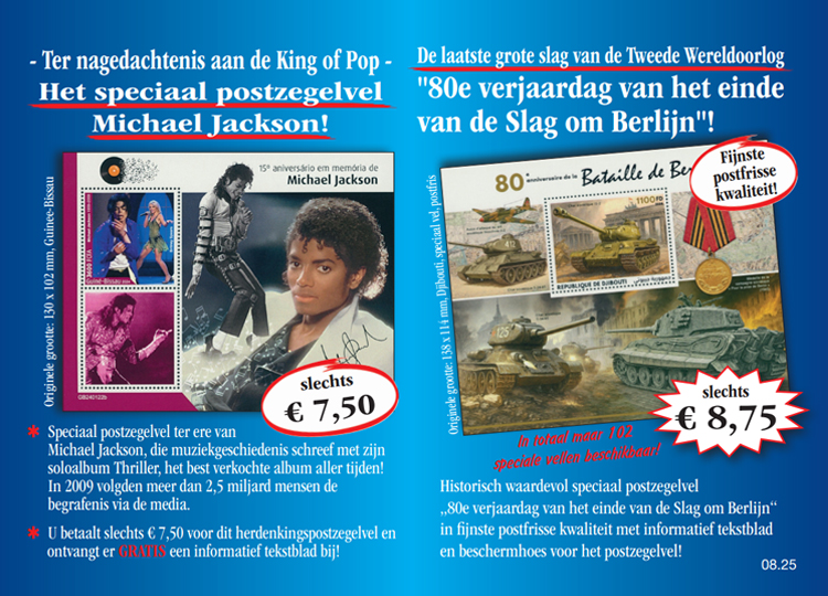 Winkelwagen U heeft nog geen artikelen in uw winkelwagen. Het postfris speciaal postzegelvel „King of Pop – Michael Jackson“! Verzekert u zich vandaag nog van het postfris speciaal postzegelvel „King of Pop – Michael Jackson“ incl. informatief tekstblad en beschermhoes voor het postzegelvel voor de speciale prijs van slechts € 7,50 en maandelijks verdere uitgaven uit deze verzameling vrijblijvend en zonder koopverplichting ter inzage. U heeft bij iedere levering een 14 dagen teruggaverecht! 7,50 € incl. wettelijke BTW Aantal: Excl. aandelige verzendkosten Dit artikel kan slechts 5 keer per klant besteld worden. Bij vragen graag contact opnemen met onze klantenservice. Het postfris speciaal postzegelvel „80e verjaardag van het einde van de Slag om Berlijn“! Verzekert u zich vandaag nog van het postfris en historisch waardevol speciaal postzegelvel „80e verjaardag van het einde van de Slag om Berlijn“ incl. informatief tekstblad en beschermhoes voor het postzegelvel voor de speciale prijs van slechts € 8,75 en maandelijks verdere uitgaven uit deze verzameling vrijblijvend en zonder koopverplichting ter inzage. U heeft bij iedere levering een 14 dagen teruggaverecht! 8,75 € incl. wettelijke BTW Aantal: Excl. aandelige verzendkosten Dit artikel kan slechts 5 keer per klant besteld worden. Bij vragen graag contact opnemen met onze klantenservice.