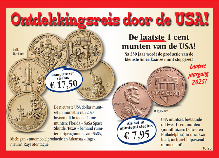 Winkelwagen U heeft nog geen artikelen in uw winkelwagen. De USA dollar muntset „Innovation - Dollar“ van 2025! Verzekert u zich nog vandaag van de USA dollar muntset „Innovation - Dollar“ van 2025, bestaande uit 4 munten en inclusief muntetui, voor de speciale prijs van slechts € 17,50. Maandelijks ontvangt u een verdere uitgave uit deze verzameling vrijblijvend en zonder koopverplichting ter inzage. U heeft bij iedere levering een 14 dagen teruggaverecht! 17,50 € incl. wettelijke BTW Aantal: Excl. aandelige verzendkosten Dit artikel kan slechts 5 keer per klant besteld worden. Bij vragen graag contact opnemen met onze klantenservice. De laatste 1 cent munten van de USA van 2025! Verzekert u zich nog vandaag van de laatste 1 cent munten van de USA van 2025, bestaande uit twee 1 cent munten (munthuizen: Denver en Philadelphia) in unc. kwaliteit en inclusief passend muntetui, voor de speciale prijs van slechts € 7,95. Maandelijks ontvangt u een verdere uitgave uit deze verzameling vrijblijvend en zonder koopverplichting ter inzage. U heeft bij iedere levering een 14 dagen teruggaverecht! 7,95 € incl. wettelijke BTW Aantal: Excl. aandelige verzendkosten Dit artikel kan slechts 5 keer per klant besteld worden. Bij vragen graag contact opnemen met onze klantenservice. Misschien is het volgende ook interessant voor u!
