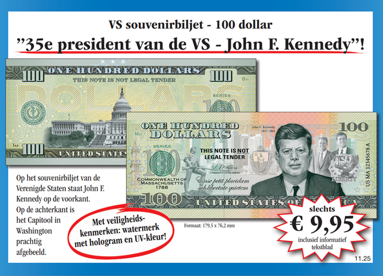 Winkelwagen U heeft nog geen artikelen in uw winkelwagen. Het souvenir bankbiljet van 100 dollar uit de USA „35e president van de VS – John F. Kennedy“! Bestel vandaag nog het souvenir bankbiljet van 100 dollar uit de USA „35e president van de VS – John F. Kennedy“, inclusief informatief tekstblad en beschermhoes, voor de speciale prijs van slechts € 9,95 en ontvang maandelijks andere uitgaven uit deze collectie vrijblijvend en ter inzage. Bij elke levering heeft u 14 dagen recht op retour! 9,95 € incl. wettelijke BTW Aantal: Excl. aandelige verzendkosten Dit artikel kan slechts 5 keer per klant besteld worden. Bij vragen graag contact opnemen met onze klantenservice.