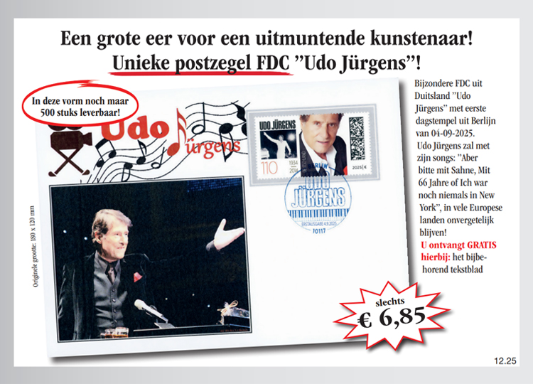 Winkelwagen U heeft nog geen artikelen in uw winkelwagen. De unieke FDC voor een uitmuntende artiest „Udo Jürgens“! Verzeker u nog vandaag van de unieke FDC voor een uitmuntende artiest „Udo Jürgens“ voor de speciale prijs van slechts € 6,85! Gratis hierbij: het passende documentatie tekstblad en de beschermhoes voor de FDC! En ontvang maandelijks een verdere uitgave uit deze verzameling vrijblijvend en zonder koopverplichting ter inzage. U heeft bij iedere levering een 14 dagen teruggaverecht! 6,85 € incl. wettelijke BTW Aantal: Excl. aandelige verzendkosten Dit artikel kan slechts 5 keer per klant besteld worden. Bij vragen graag contact opnemen met onze klantenservice. Misschien is het volgende ook interessant voor u!
