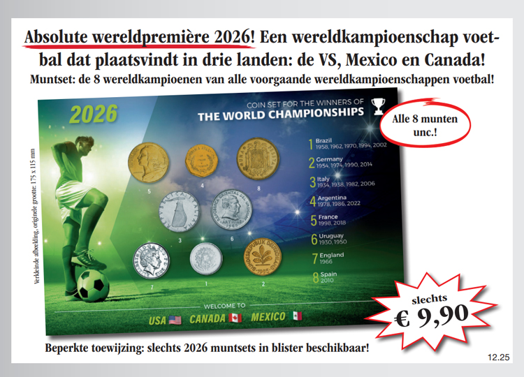 Winkelwagen U heeft nog geen artikelen in uw winkelwagen. De documentatie muntset: Alle titelwinnaars van de wereldkampioenschappen voetbal 1930 tot 2022! Verzeker u nog vandaag van de documentatie muntset met munten van alle titelwinnaars van de wereldkampioenschappen voetbal 1930 tot 2022 in een hoogwaardige blisterverpakking (8 munten uit Brasilië, Duitsland, Italië, Argentinië, Frankrijk, Uruguay, Engeland en Spanje) voor de speciale prijs van slechts € 9,90! En ontvang maandelijks een verdere uitgave uit deze verzameling vrijblijvend en zonder koopverplichting ter inzage. U heeft bij iedere levering een 14 dagen teruggaverecht! 9,90 € incl. wettelijke BTW Aantal: Excl. aandelige verzendkosten Dit artikel kan slechts 5 keer per klant besteld worden. Bij vragen graag contact opnemen met onze klantenservice. Misschien is het volgende ook interessant voor u!