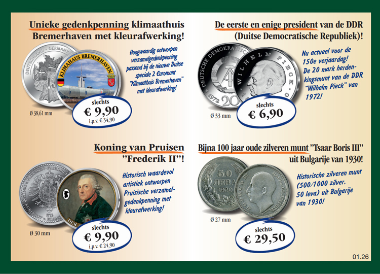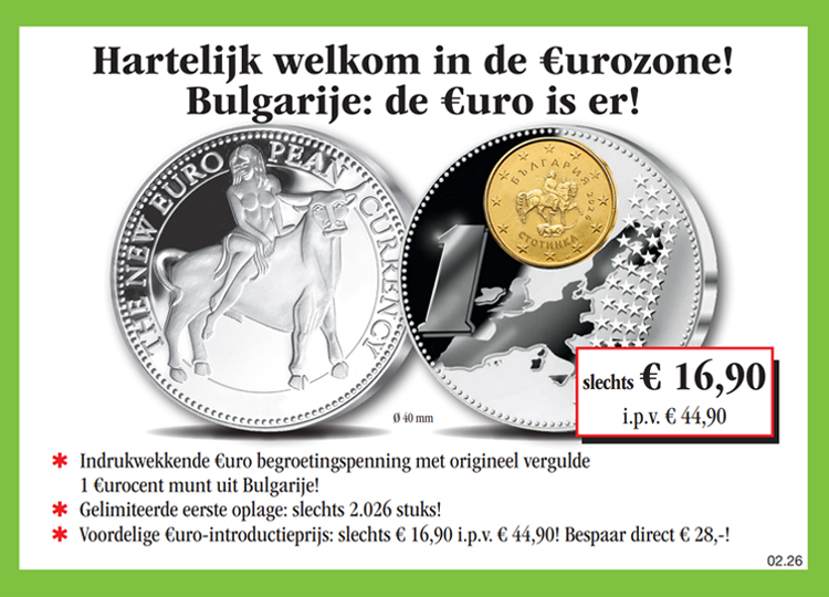 Winkelwagen U heeft nog geen artikelen in uw winkelwagen. De complete euromuntset „Bulgarije 2026“! Verzekert u vandaag nog de complete euromuntset „Bulgarije 2026“ (8 munten: 1 cent tot 2 euro) in unc. verzamelkwaliteit, inclusief de passende presentatiecassette, voor de speciale prijs van slechts € 12,90! Maandelijks ontvangt u een verdere uitgave uit deze verzameling vrijblijvend en zonder koopverplichting ter inzage. U heeft bij iedere levering een 14 dagen teruggaverecht! 12,90 € incl. wettelijke BTW Aantal: Excl. aandelige verzendkosten Dit artikel kan slechts 5 keer per klant besteld worden. Bij vragen graag contact opnemen met onze klantenservice. Misschien is het volgende ook interessant voor u!